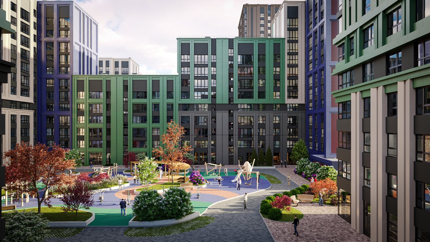 Первая очередь домов получила название «Энтузиазм». Это два первых литера 45/1 и 45/2, и двор с открытой фитнес-зоной для тренировок, интерактивными инсталляциями, игровым пространством 0+ для детей, уличными тренажерами, зонами для отдыха. Продуманы пространства для жителей всех возрастов и физических возможностей.